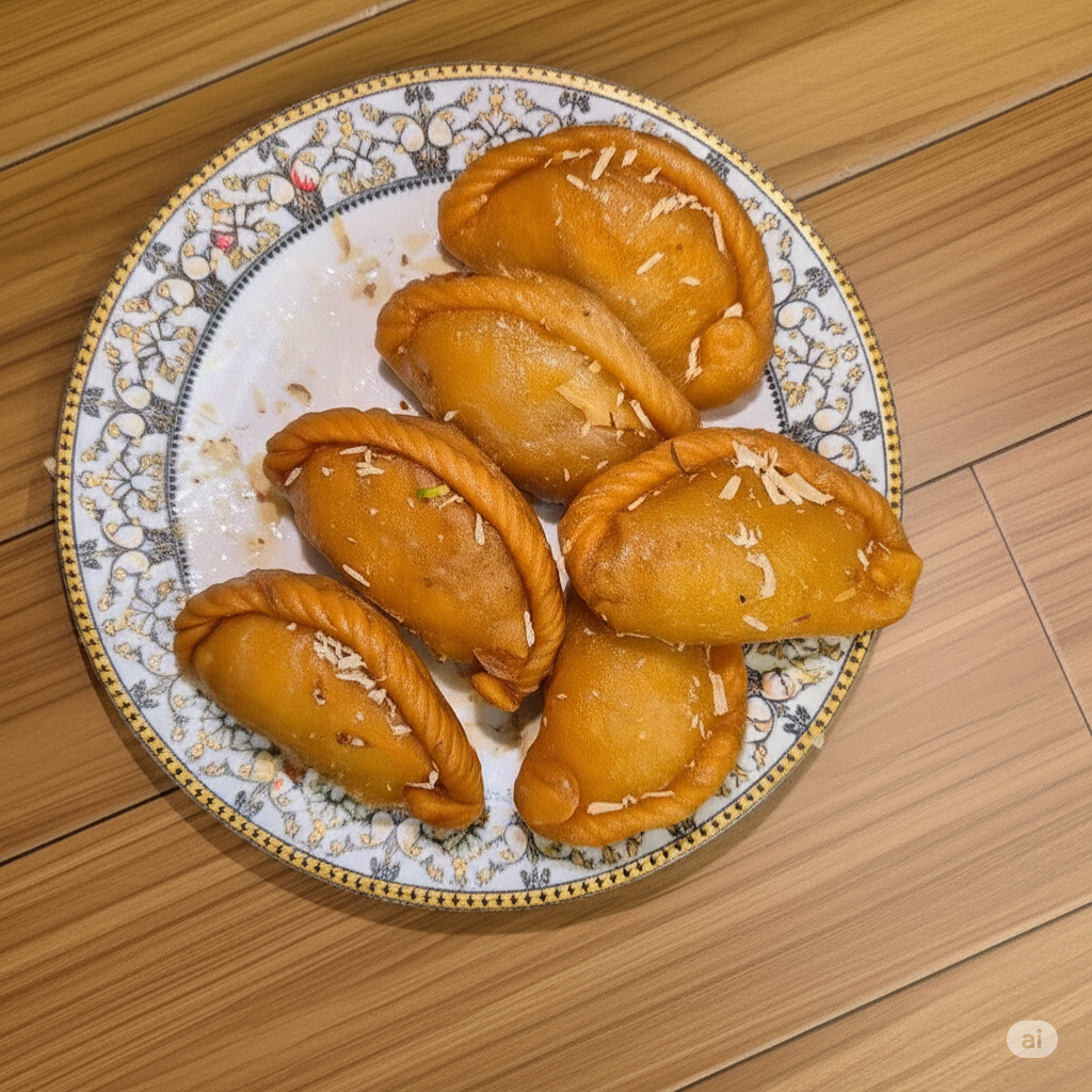 Gujiya is a traditional Indian sweet dumpling made with a crisp, golden outer shell and a rich, flavorful filling. The outer layer is prepared from refined flour (maida) and shaped into a half-moon pocket. Inside, it is stuffed with a delicious mixture of khoya (mawa), dry fruits, coconut, and cardamom, giving it a perfect balance of sweetness and aroma.