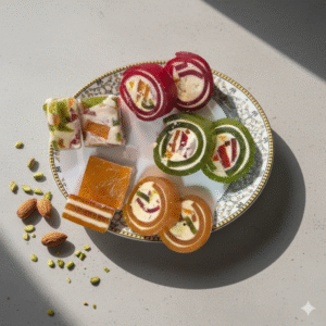 Ice Cream Rolls Barfi is a delightful fusion sweet that combines the creamy taste of ice cream with the richness of traditional barfi. Made from premium khoa, milk, and sugar, this barfi is whipped until smooth and flavored with notes of vanilla, cardamom, and pista, giving it a cool, ice-cream-like taste.