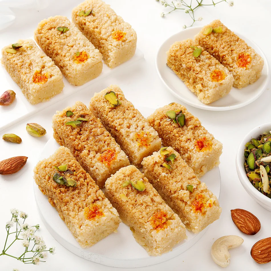 Milk Cake, also known as Kalakand, is a classic Indian sweet cherished for its rich, caramelized flavor and soft, grainy texture. Made by slowly simmering full-fat milk and sugar, this delicacy is flavored with cardamom and often garnished with slivers of pistachio or almonds. The result is a melt-in-the-mouth treat that embodies the essence of traditional Indian confectionery. Ideal for celebrations, festivals, or as a thoughtful gift, Milk Cake is 100% vegetarian and prepared using authentic methods to deliver an indulgent experience in every bite.